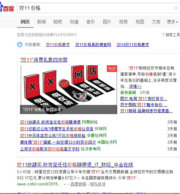 “雙11”購物狂歡節(jié),大家購得不亦樂乎!小編本著理智再理智的態(tài)度,堅(jiān)守“網(wǎng)購就剁手”的原則,成功按耐住了內(nèi)心的“狂熱與激動(dòng)”!今早小編閑來無聊,百度了一下“雙11 價(jià)格”,搜出來的的標(biāo)題列表并沒有讓我覺得意外!
