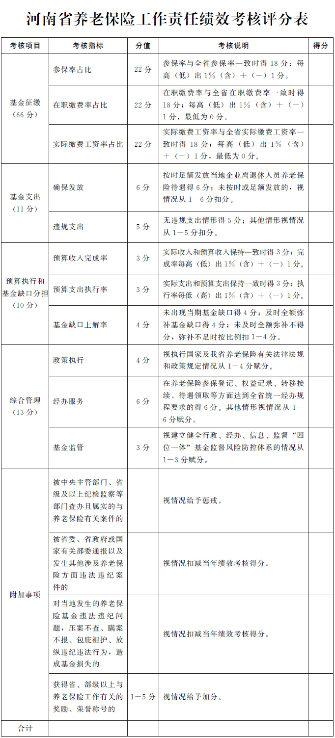 第十二條 績效考核采用百分制、量化評分的方式進行,得分為考核期內(nèi)各項考核指標分值之和,詳見《河南省養(yǎng)老保險工作責(zé)任績效考核評分表》。