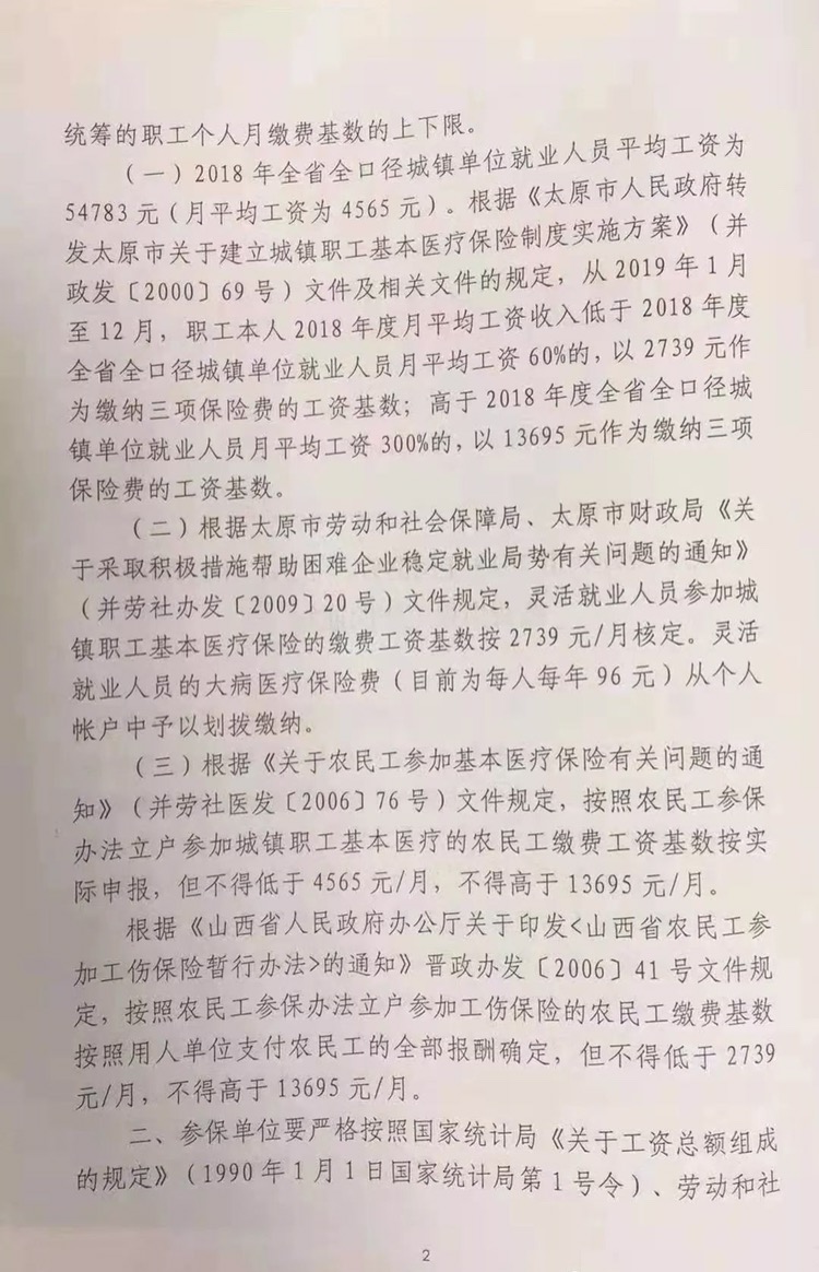 (一)2018年全省全口徑城鎮(zhèn)單位就業(yè)人員平均工資為54783元(月平均工資為4565元)。根據(jù)《太原市人民政府轉(zhuǎn)發(fā)太原市關(guān)于建立城鎮(zhèn)職工基本醫(yī)療保險(xiǎn)制度實(shí)施方案》(并政發(fā)〔2000〕69號(hào))文件及相關(guān)文件的規(guī)定,從2019年1月至12月,職工本人2018年度月平均工資收入低于2018年度全省全口徑城鎮(zhèn)單位就業(yè)人員月平均工資60%的,以2739元作為繳納三項(xiàng)保險(xiǎn)費(fèi)的工資基數(shù);高于2018年度全省全口徑城鎮(zhèn)單位就業(yè)人員月平均工資300%的,以13695元作為繳納三項(xiàng)保險(xiǎn)費(fèi)的工資基數(shù)。