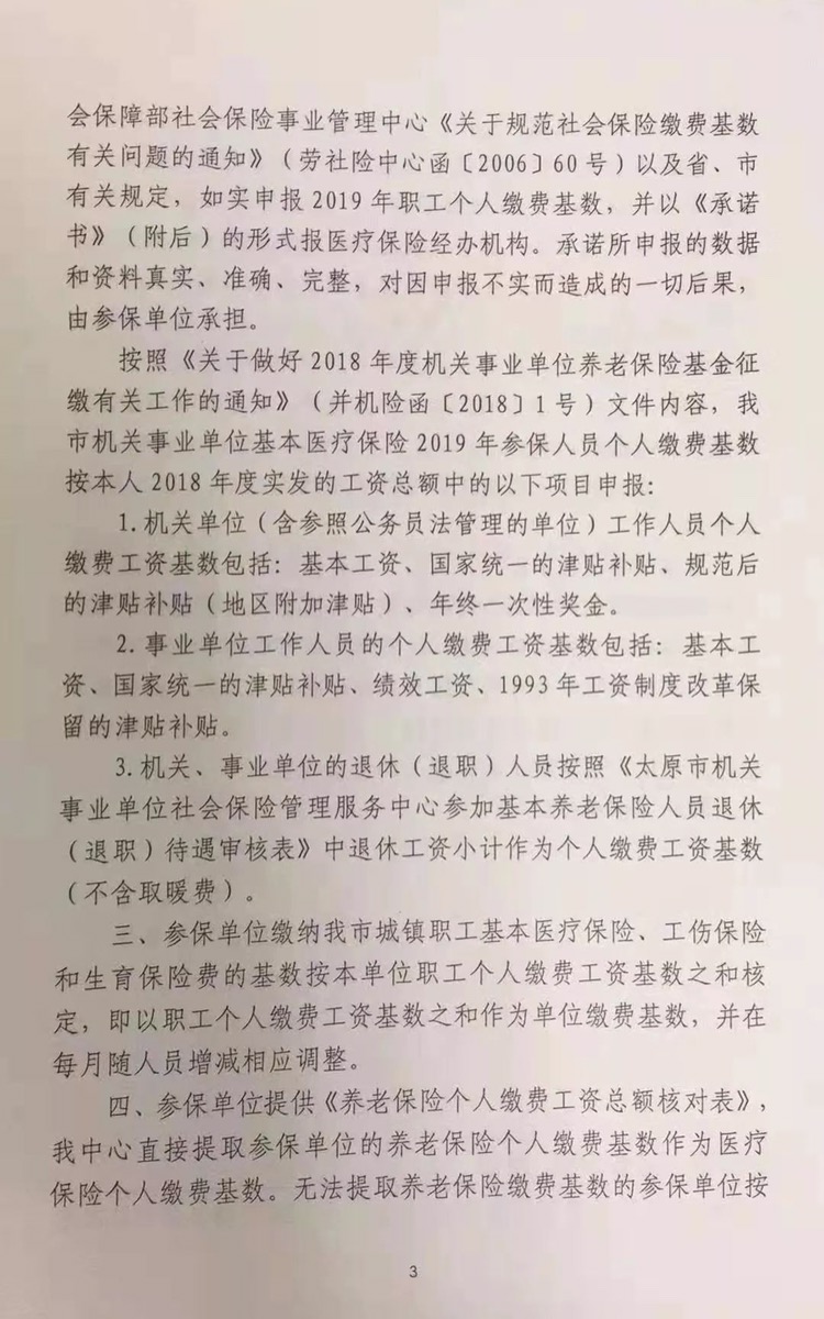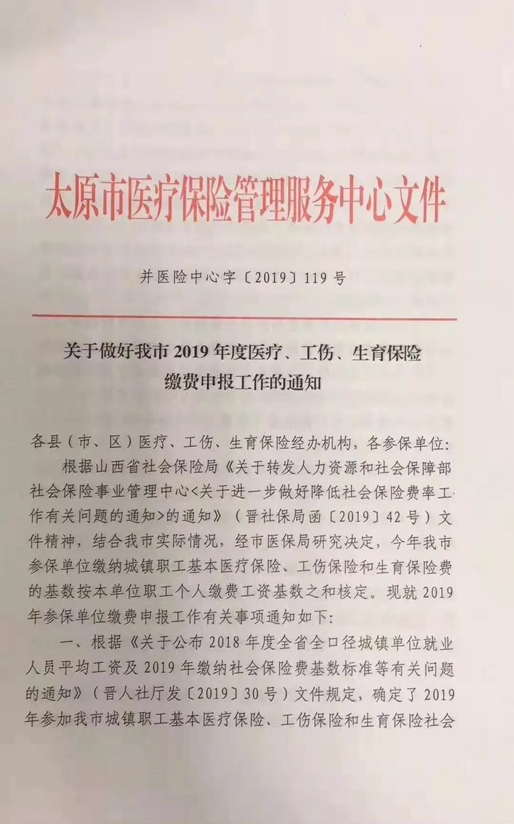 根據(jù)山西省社會(huì)保險(xiǎn)局《關(guān)于轉(zhuǎn)發(fā)人力資源和社會(huì)保障部社會(huì)保險(xiǎn)事業(yè)管理中心<關(guān)于進(jìn)一步做好降低社會(huì)保險(xiǎn)費(fèi)率工作有關(guān)問題的通知>的通知》(晉社保局函〔2019〕42號(hào))文件精神,結(jié)合我市實(shí)際情況,經(jīng)市醫(yī)保局研究決定,今年我市參保單位繳納城鎮(zhèn)職工基本醫(yī)療保險(xiǎn)、工傷保險(xiǎn)和生育保險(xiǎn)費(fèi)的基數(shù)按本單位職工個(gè)人繳費(fèi)工資基數(shù)之和核定。現(xiàn)就2019年參保單位繳費(fèi)申報(bào)工作有關(guān)事項(xiàng)通知如下:
