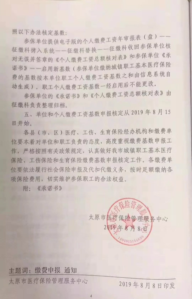 摘要 2019年太原市參保單位繳納城鎮(zhèn)職工基本醫(yī)療保險(xiǎn)、工傷保險(xiǎn)和生育保險(xiǎn)費(fèi)的單位和個(gè)人繳費(fèi)工資基數(shù)申報(bào)核定從2019年8月15日開始。