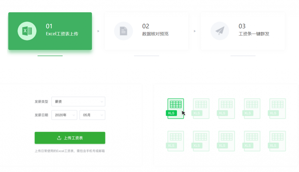 第一步:上傳原始的Excel工資表,這里的工資表模板不做限制,HR可以使用原來的工資表,也可以通過螞蟻工資條官網(wǎng)下載合適的工資表模板使用。