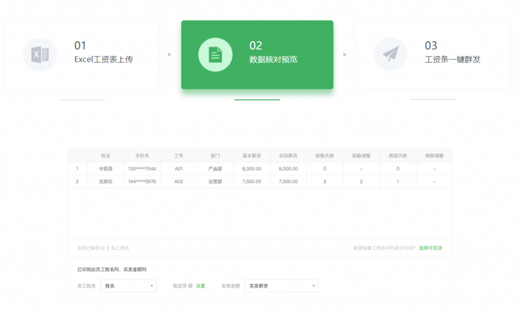 第二步:數(shù)據(jù)核對,上傳工資表后,螞蟻工資條會自動解析生成對應(yīng)的工資條,需要HR簡單的看下生成內(nèi)容是否有出錯現(xiàn)象(一般來說不會出錯哦,螞蟻工資條上線前經(jīng)過充分的測試,可解析市面上99%的工資表模板)