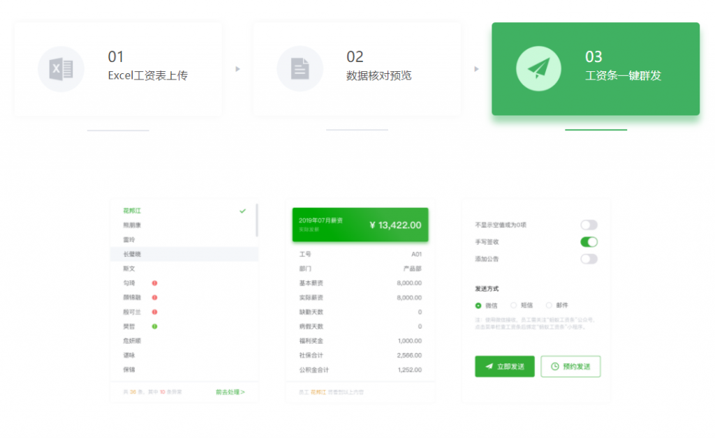 發(fā)薪方式快捷簡單:進入網(wǎng)頁端(無需下載App),僅需三步,就可實現(xiàn)工資條的發(fā)放。有效節(jié)省發(fā)薪時間成本,提升效率。