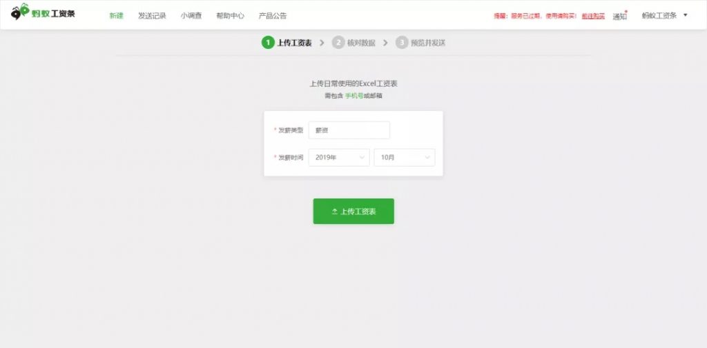 第二步:選擇發(fā)薪類型和時間,并點擊“上傳工資表”按鈕,將已經(jīng)編輯好的工資表上傳至螞蟻工資條。