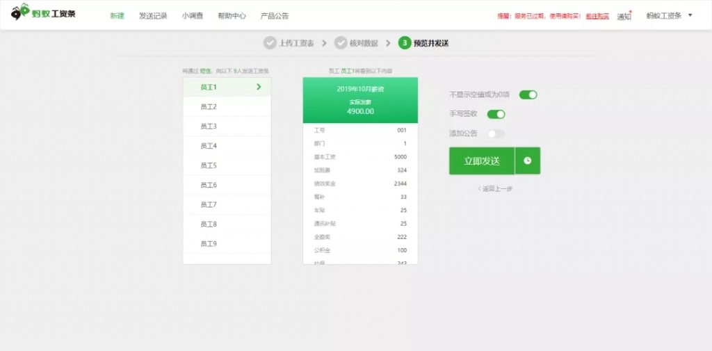 第四步:預(yù)覽工資條樣式,點擊立即發(fā)送,即可成功發(fā)送工資條。