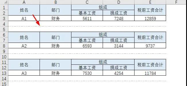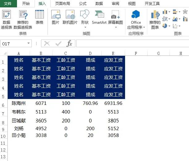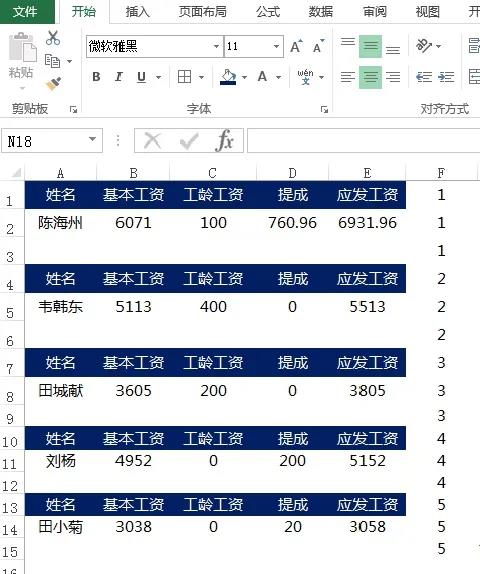 插入空行的要點:人員名單減1行,就是需要插入的行數(shù)。比如下面這個工資表有5個人,我們就需要插入4行。?