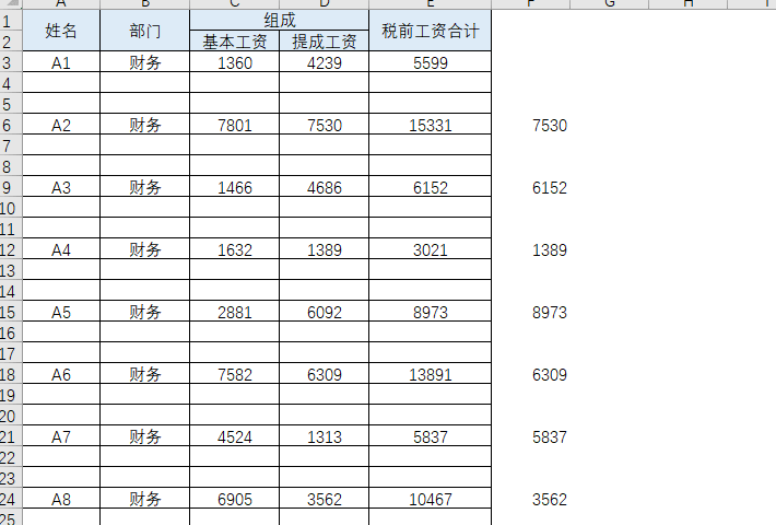 網(wǎng)上利用Excel制作工資條的教程已有很多,如排序法、公式法等。但遇到今天的工資條這些方法就很難做到了: