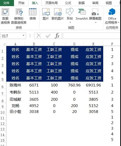 在表中選擇2.3.4.5行,然后用鼠標(biāo)拖拽來生成一個工資條。