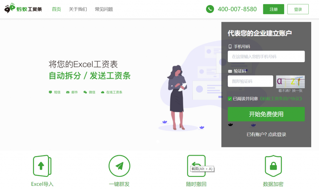1.螞蟻工資條,專業(yè)的工資條群發(fā)軟件,點擊鏈接:https://gzt.mayihr.com/,注冊并登陸。