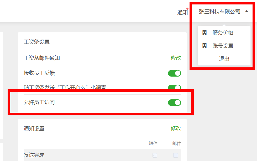 2.登陸后點擊頁面右上角的公司名,選擇【賬號設(shè)置】,在新打開頁面中找到“允許員工訪問”一欄,其后選框如果是綠色,就不用管;如果是灰色,就點擊勾選——注意,綠色表示允許,灰色表示不允許,我們發(fā)微信工資條,需要允許!