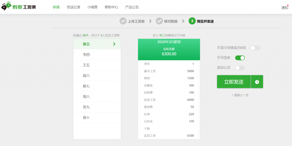 需要注意,上傳的Excel工資表中必須要有聯(lián)系方式,短信或郵箱都行。