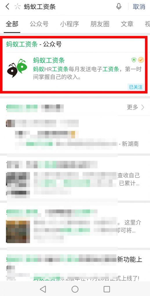 1.微信查看需要關(guān)注“螞蟻工資條”公眾號,可以微信內(nèi)直接搜索關(guān)注。為方便員工,HR也可以發(fā)公眾號二維碼給員工,前面第二步提到的【賬號設(shè)置】頁面有公眾號二維碼圖片。