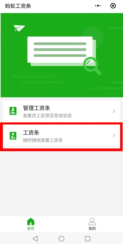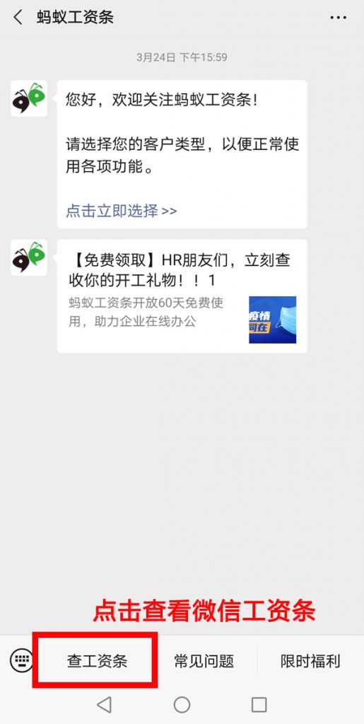 2.點擊“螞蟻工資條”公眾號菜單欄【查工資條】。