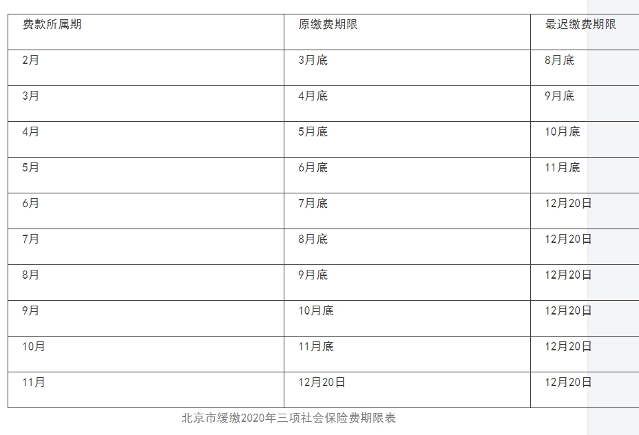 我市社會保險費實行“當月申報、次月收繳”的模式。參保單位2月份社會保險費,應(yīng)當于3月底前繳納,3月申請緩繳后,應(yīng)于8月底前繳納,以此類推(參見下表)。根據(jù)緩繳執(zhí)行期要求,6月至11月的應(yīng)繳社保費,參保單位最遲應(yīng)于2020年12月20日前繳清。
