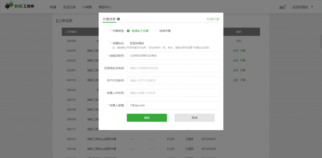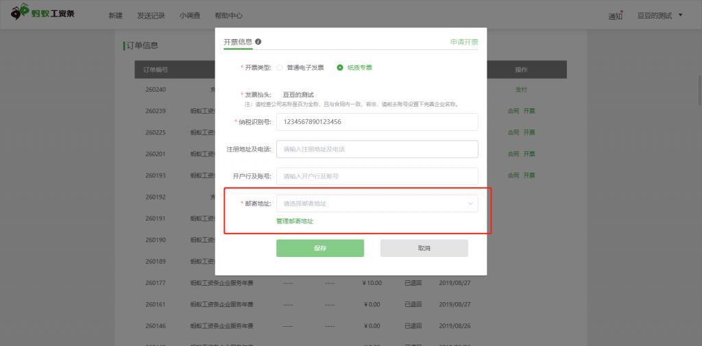 2),選擇開票類型,填寫開票信息并保存,其中,發(fā)票抬頭默認(rèn)賬號信息下的企業(yè)名稱。除了基本發(fā)票信息必填外,電子發(fā)票必須填寫收票人郵箱,紙質(zhì)發(fā)票必須填寫郵寄地址,郵寄地址可以在管理郵寄地址下添加和修改;
