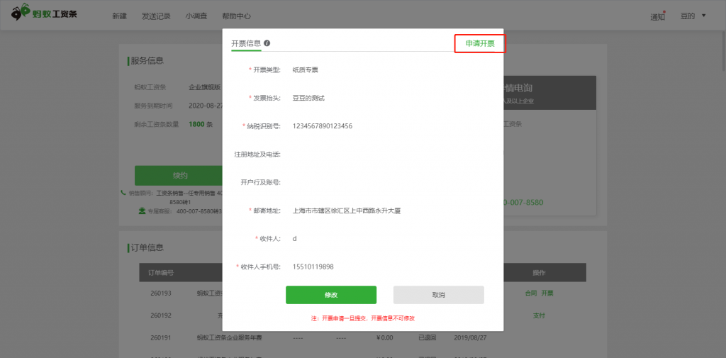 3),提交開票申請,申請一旦提交后,前臺無法再修改開票信息,如需修改,需要聯(lián)系對應(yīng)銷售或客服;申請?zhí)峤缓?,電子發(fā)票系統(tǒng)會(huì)在3個(gè)工作日內(nèi),發(fā)送至用戶填寫的郵箱,紙質(zhì)發(fā)票財(cái)務(wù)會(huì)在每周四人工開票后,郵寄至用戶填寫的郵寄地址;用戶可以在開票申請層,查看開票狀態(tài);