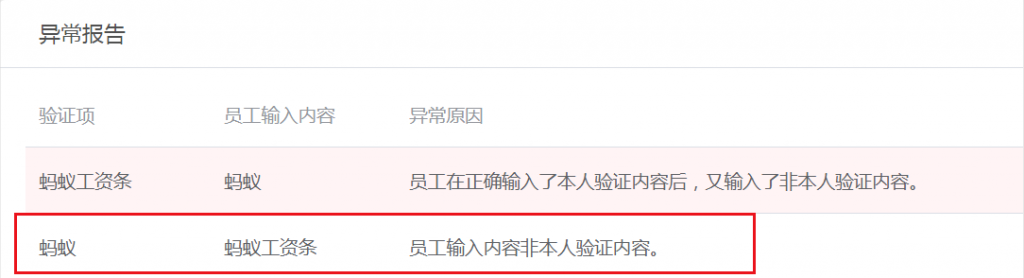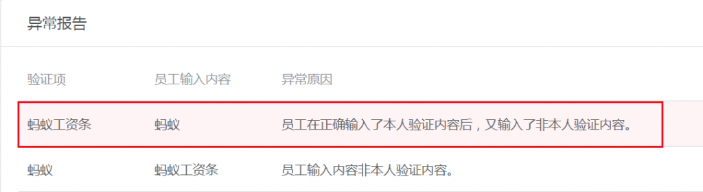 第四步:點(diǎn)擊提醒下的查看詳情。HR就可在異常報(bào)告中查看具體異常原因。此時(shí)異常原因高亮顯示:員工在正確輸入本人驗(yàn)證內(nèi)容后,又輸入了非本人驗(yàn)證內(nèi)容。