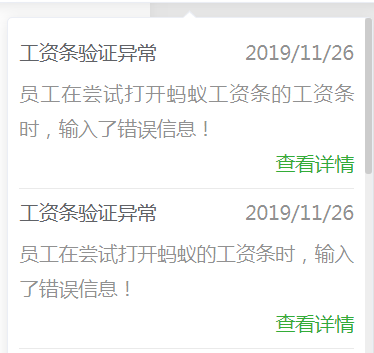 第三步:員工在已查看了工資條后,再次輸入了錯(cuò)誤的驗(yàn)證信息。HR后臺通知中會(huì)再次出現(xiàn)錯(cuò)誤提醒。