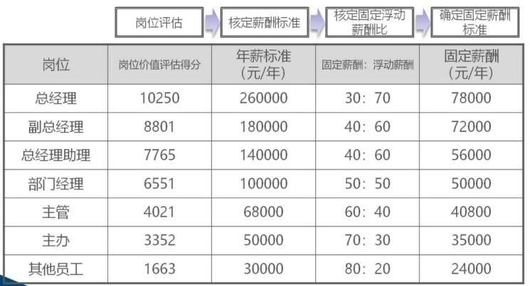 年薪比例法是設(shè)計(jì)者在計(jì)算員工基本薪酬時(shí),首先確定年度薪酬水平和年薪中基薪和績(jī)效薪金的比例,再由此反推每類(lèi)員工的基本薪酬水平。這種方法有利于企業(yè)工資總額的整體控制,有利于管理者對(duì)員工收入水平的整體把握。員工也能對(duì)不同崗位級(jí)別的薪酬差距形成共識(shí),減少不公平感。