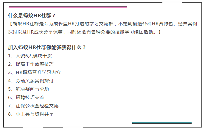 3、所有參與勞動合同法學習活動的小伙伴,均有機會加入螞蟻HR高階社群,享受群內所有人資干貨和資源。