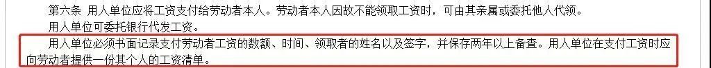 用人單位必須書面記錄支付勞動者工資的數(shù)額、時間、領(lǐng)取者的姓名以及簽字,并保存兩年以上備查。