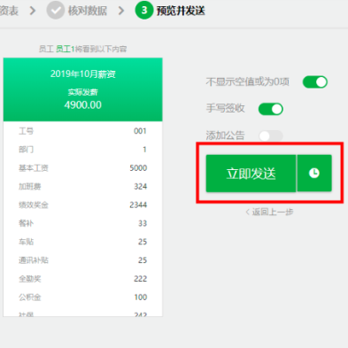 預覽工資條樣式,HR自主選擇是否開啟“手寫簽收”或“添加公告”,確認無誤后點擊【立即發(fā)送】。