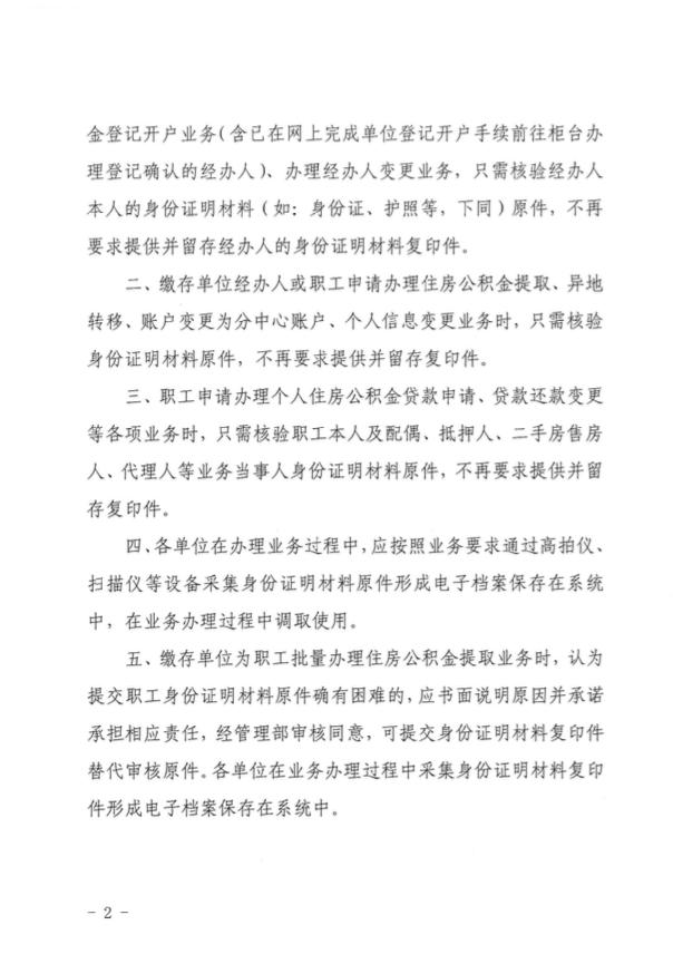 摘要 本次通知內(nèi)容包括:1.繳存單位經(jīng)辦人在公積金管理柜臺(tái)辦理登記開(kāi)戶、辦理經(jīng)辦人變更業(yè)務(wù),只需核驗(yàn)經(jīng)辦人本人身份證原件;2.繳存單位經(jīng)辦人或職工申請(qǐng)辦理公積金提取、異地轉(zhuǎn)移等只需提供身份證明材料原件等